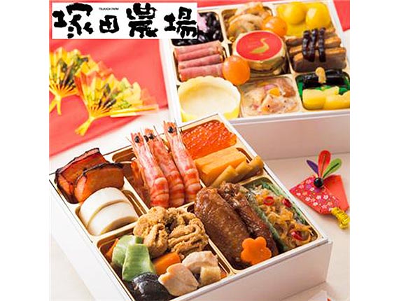 ご存知「塚田農場」のおせち。北海道産新得地鶏のチーズロール、みやざき地頭鶏の筑前煮、山形県産最上鴨のローストなど、塚田農場の食材を中心に主原料はすべて国産!こだわりのおせちです。