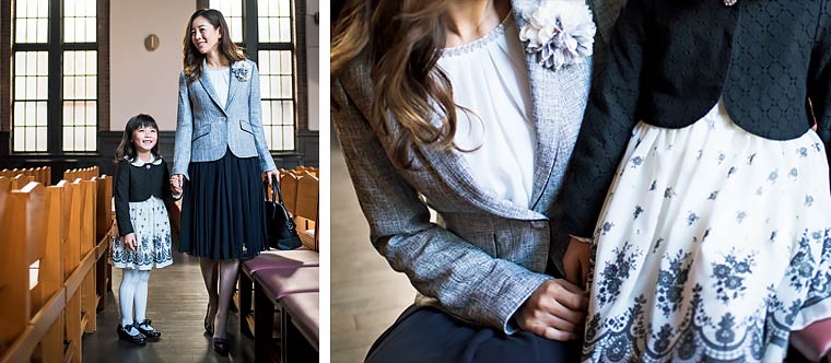 ネイビーのジャケットとピンクのコサージュを揃えた、わかりやすいリンクコーデ。ママはワンピースもジャケットに合わせてネイビーをセレクトし、きちんと感を演出。お嬢さんは花柄とシフォンで可愛らしく。中に着たワンピースで、親子に変化をつけるコーディネートです。