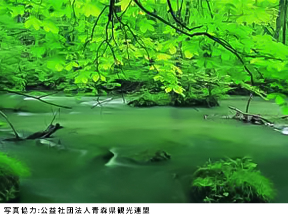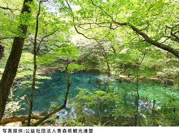 広葉樹の原生林の中、標高150m〜250mの白神山地の西麓に、約4km2にわたって点在する33の湖沼群は、大崩の展望台から12の池が見えることから十二湖と名づけられました。ベストシーズンは新緑が始まるGWから秋の紅葉の季節、中でもその青さが神秘的な雰囲気を持つ「青池」は人気のスポット。