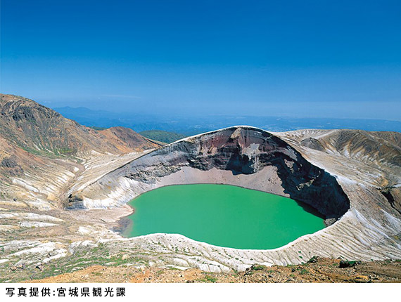 蔵王連峰の観光スポットの代表地とも言える円型の火口湖のことで、五色沼(ごしきぬま)とも呼ばれています。湖面はエメラルドグリーン色で季節や天気によりその美しい色調が変わるのが見どころです。今もなお湖底から火山ガスが継続して噴出している活火山の荒々しい火山壁と神秘的な雰囲気の湖面のコントラストの美しさは感動もの。