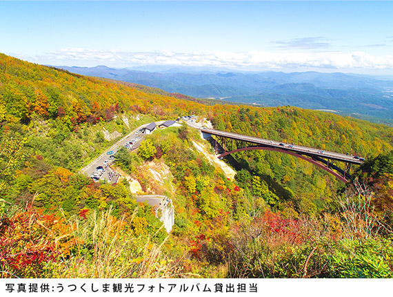 福島市西方の高湯温泉から土湯峠へ吾妻の山並みを縫うように走る全長約29km、最高標高1,622mの観光道路。日本の道百選にも選ばれていて、空に向かって走り抜けるような天空のパノラマビューが楽しめます。沿線には一切経山、吾妻小富士などの見どころもあり、四季折々の自然の美しさの中を走り抜けることができます。ビュースポットには駐車場があるほか、レストハウスやビジターセンターもあり快適にドライブが楽しめます。山々がキレイに色づく紅葉の時期は特におすすめです。