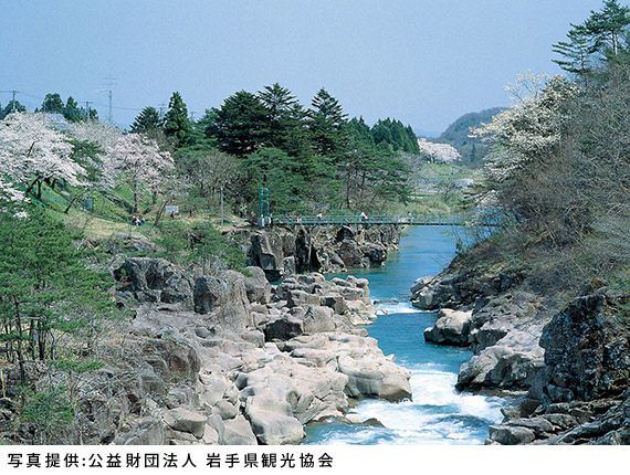 2kmに渡る一関市内へと流れる磐井川の浸食が、おう穴・滝・深淵と表情を変えながら続きます。そのダイナミックさや長い時間をかけて削られた岩肌、川岸を彩る景色は自然の美しさを十分に感じられ、国の名勝天然記念物に指定されています。「かっこうだんご(空飛ぶだんご)」は、渓流の上に張られたロープに下がるカゴへお金と注文を入れて小づちを鳴らすと、対岸にあるお店に引き上げられ、カゴにお団子とお茶が入って戻ってくる楽しい名物となっています。