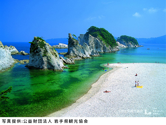 三陸復興国立公園に属し、三陸ジオパークの中心に位置する浄土ヶ浜は、三陸を代表する景勝地のひとつで国の名勝に指定されています。5200万年前のマグマの働きでできた火山石の白い岩肌が美しく、夏は海水浴を楽しむ人でにぎわいます。「日本の水浴場88選」や「日本の快水浴場百選(海の部特選)」にも選ばれているおだやかな波の入り江です。鍬形(くわがた)や八戸穴などの見どころもたくさんあります。