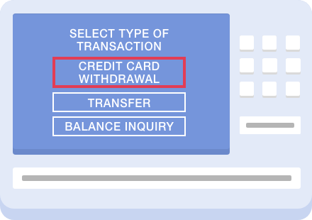 「SELECT TYPE OF TRANSACTION(取引内容を選択)」と表示されたら、取引内容を選択し、「CREDIT CARD WITHDRAWAL(クレジットカードでの引出し)」を選択します。